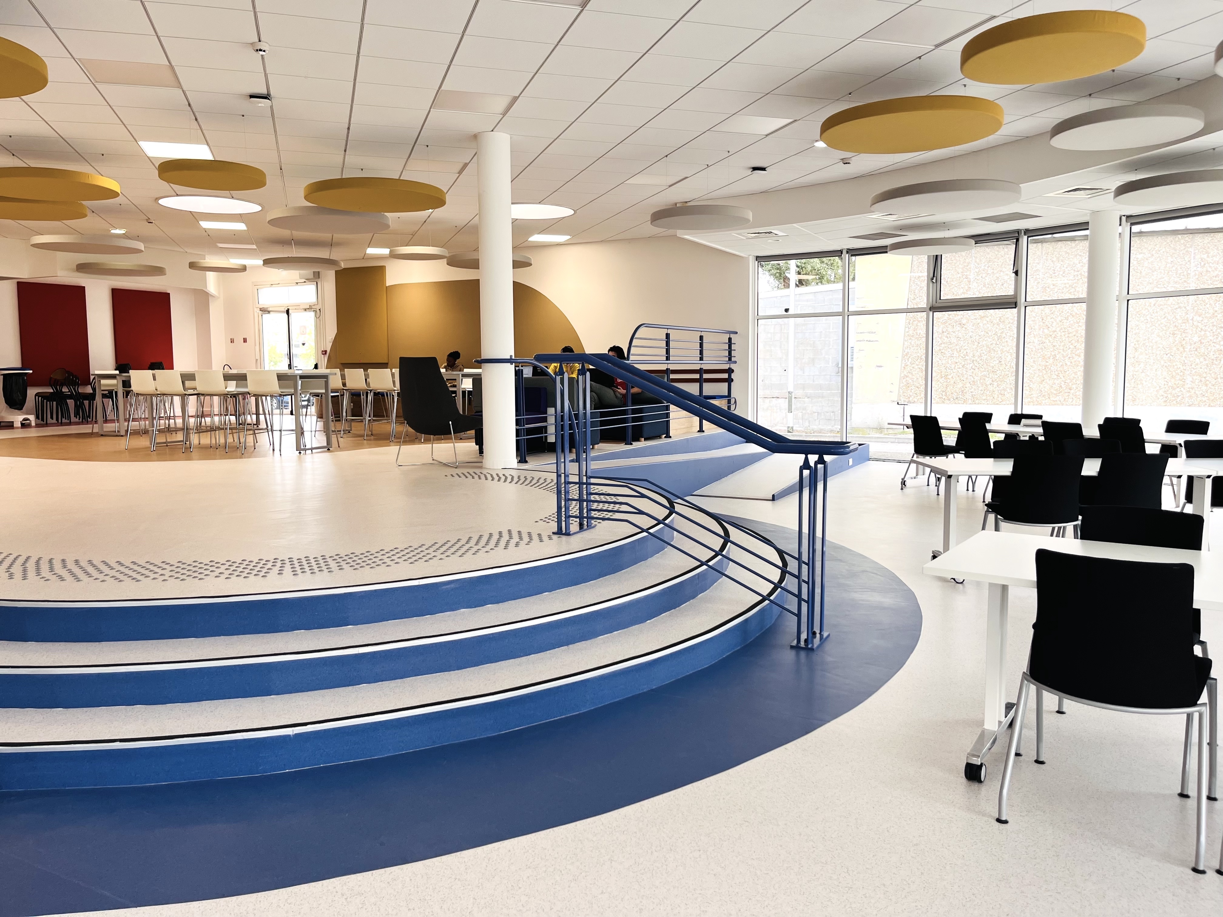 Pour le réaménagement de cette salle, l’INSA nous a demandé de concevoir un aménagement permettant de faire cohabiter, dans un même espace ouvert : des zones lunch dédiées aux repas du midi, des espaces de convivialité et de travail informel, un espace de coworking modulable, mais aussi un espace pour les conférences ou les présentations. L’espace de coworking a été réservé en premier lieu à la partie basse devant la baie circulaire, qui offre une belle lumière naturelle et diffuse. Cela augmente le confort visuel pour cet usage, et la différence de niveau avec l’espace lunch renforce la sensation de tranquillité dans ce grand espace multi-usages.