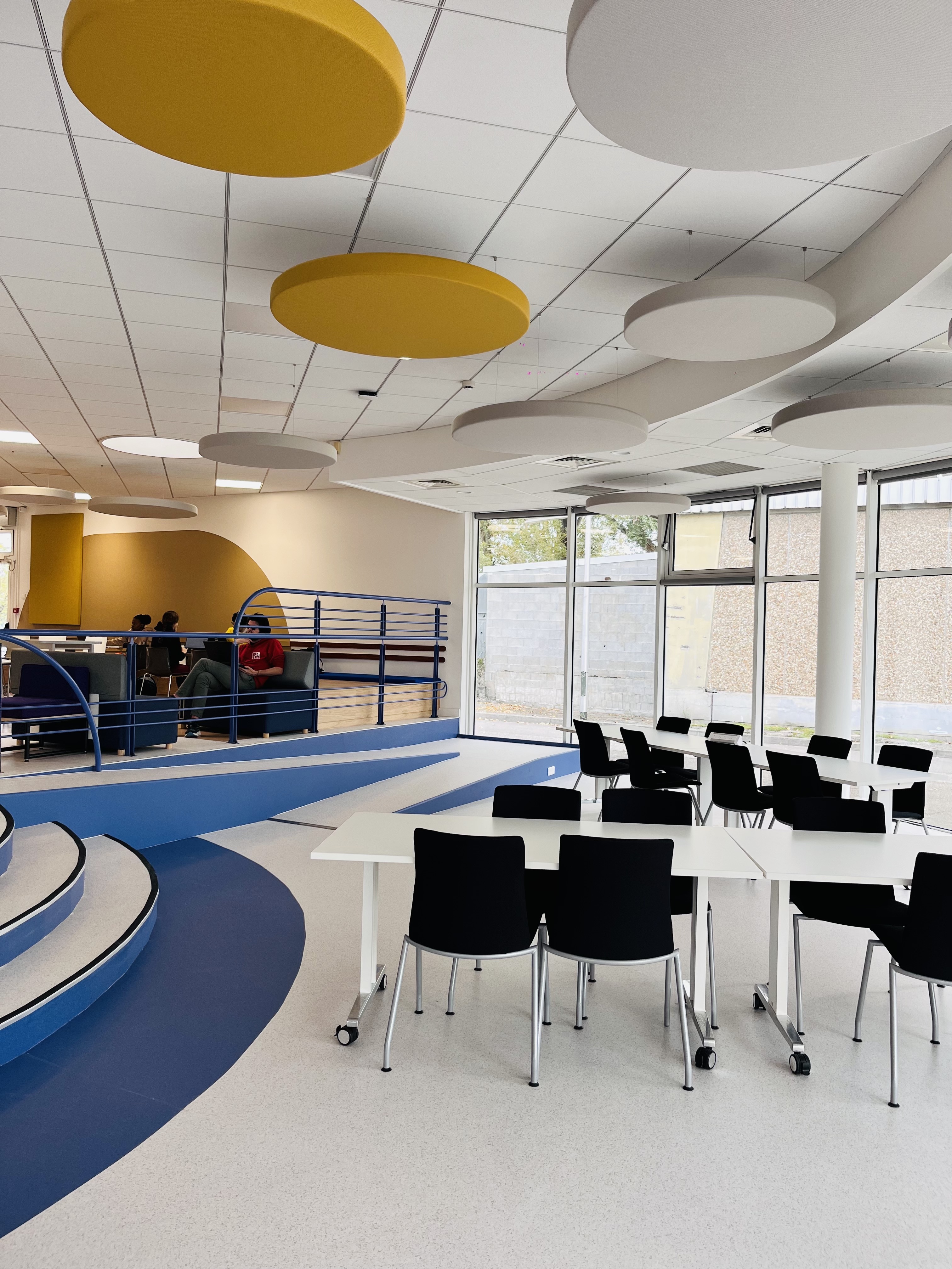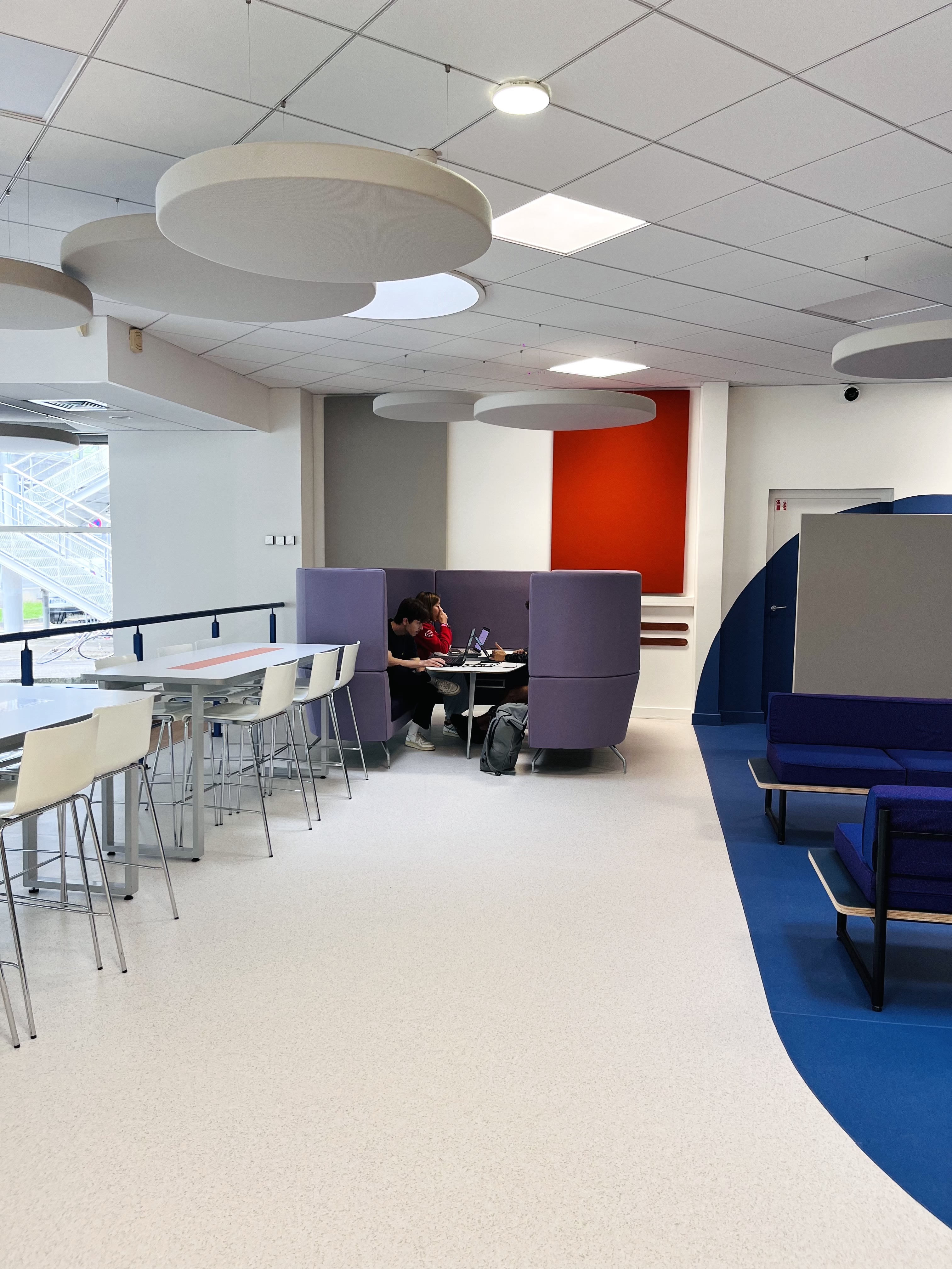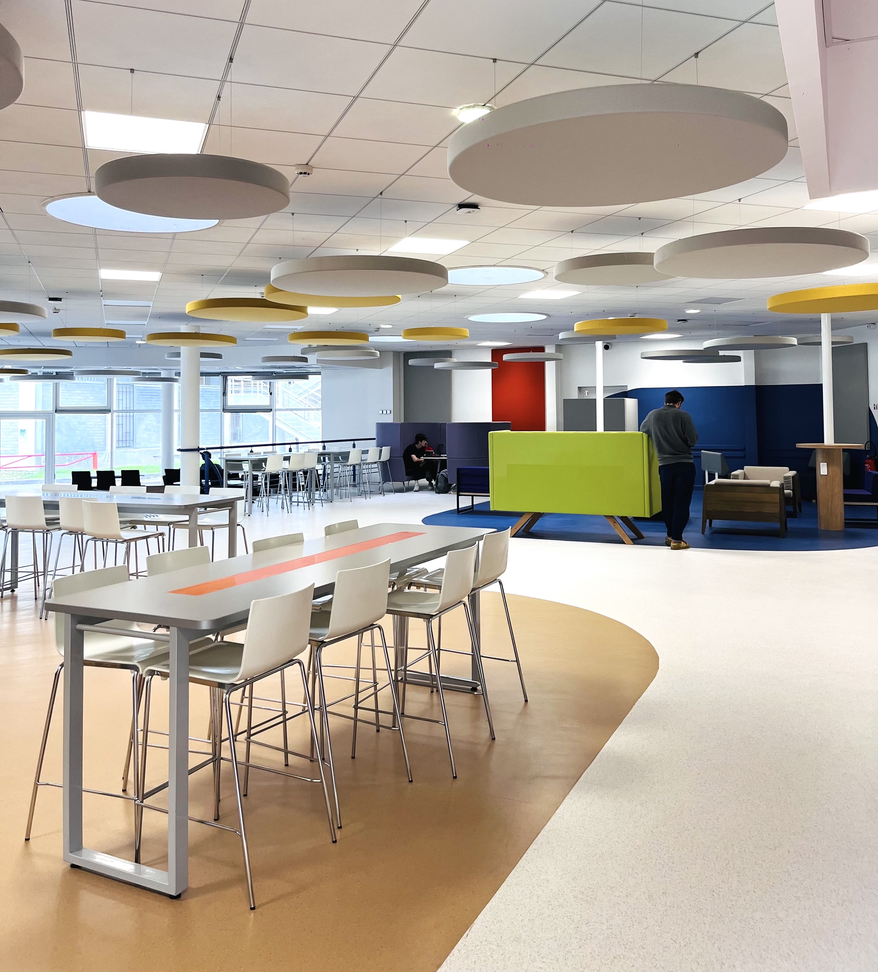 Nous avons également intégré un traitement acoustique en dalles suspendues (fabriquées à Grenoble), nous les avons choisies colorées au-dessus de la circulation centrale pour appuyer cette dernière. La forme ronde de ces dalles permet de s’abstraire visuellement du plafond standard existant et contribue à l’ambiance moderne et ludique du lieu.