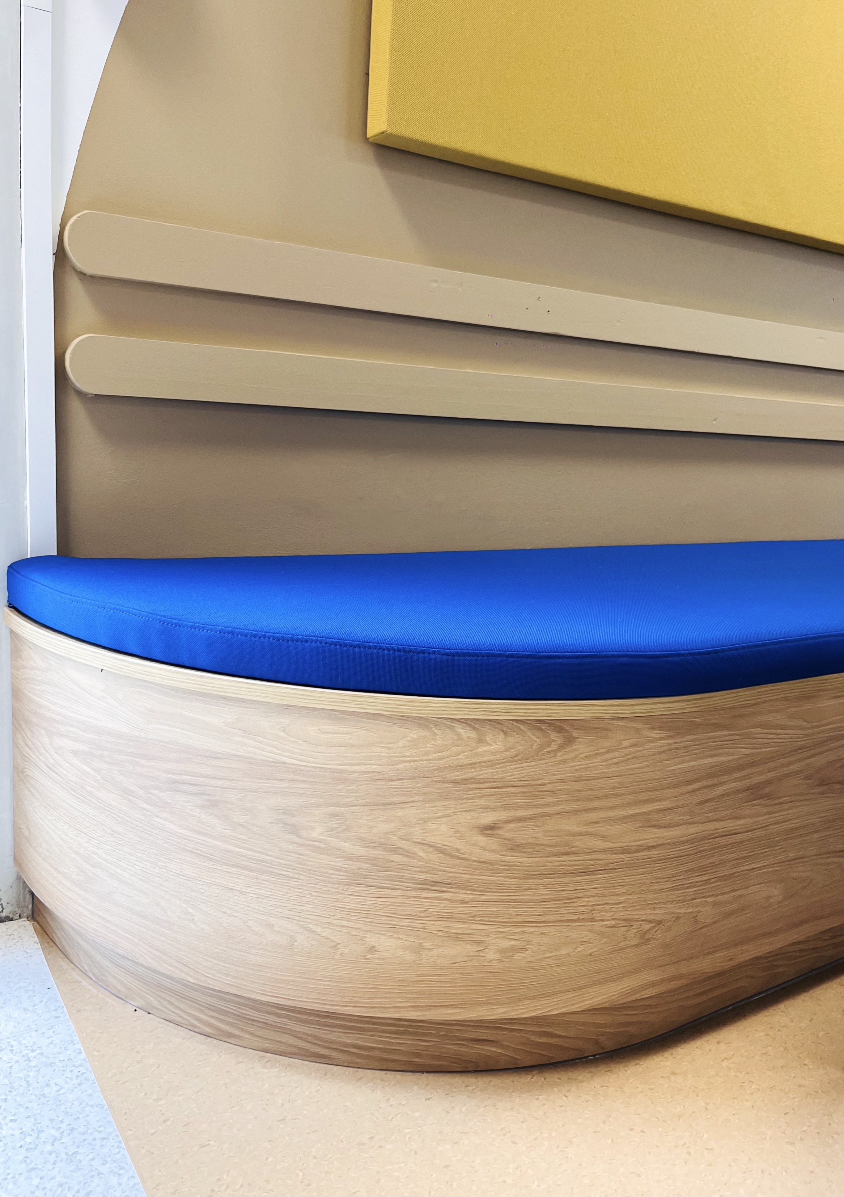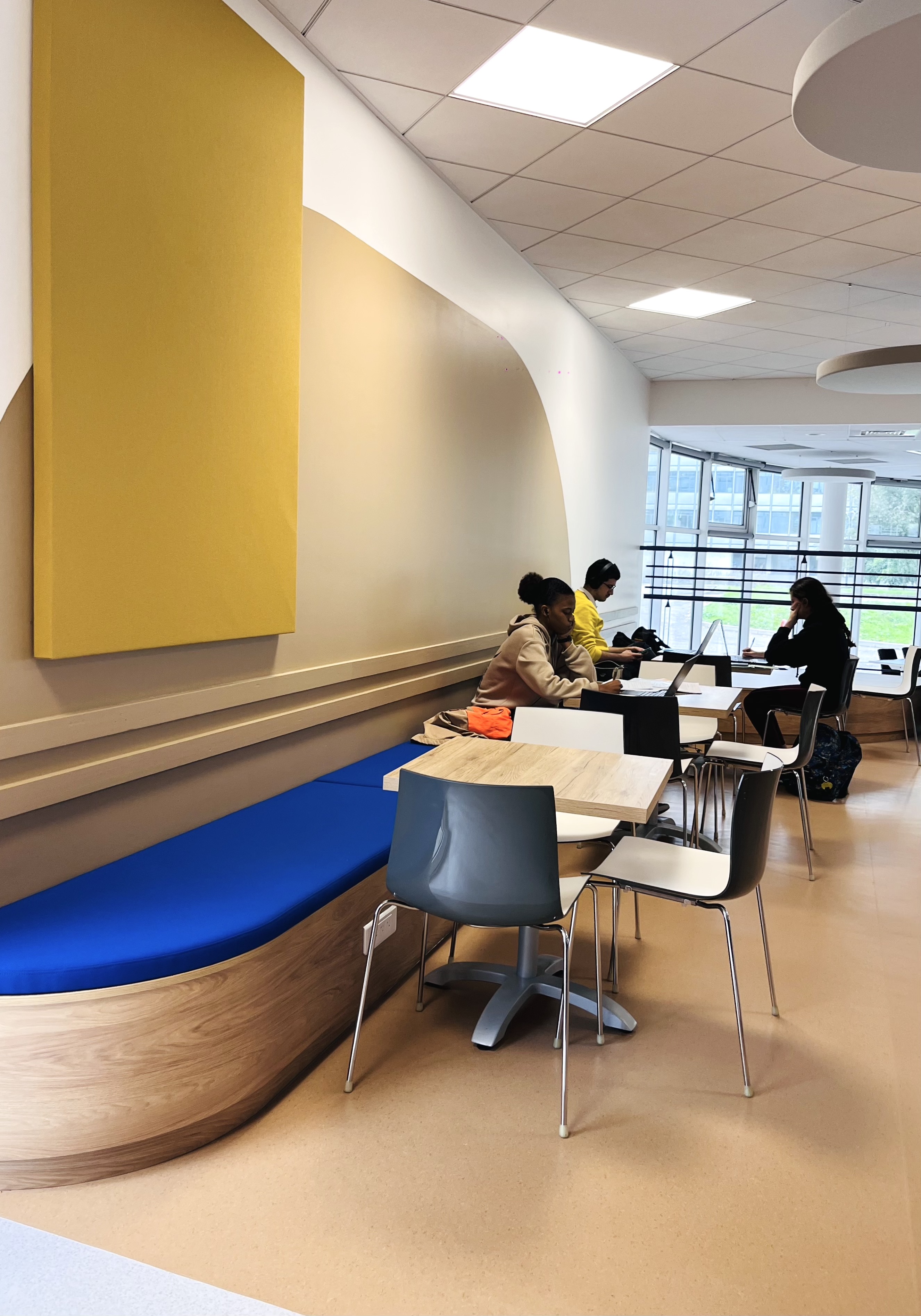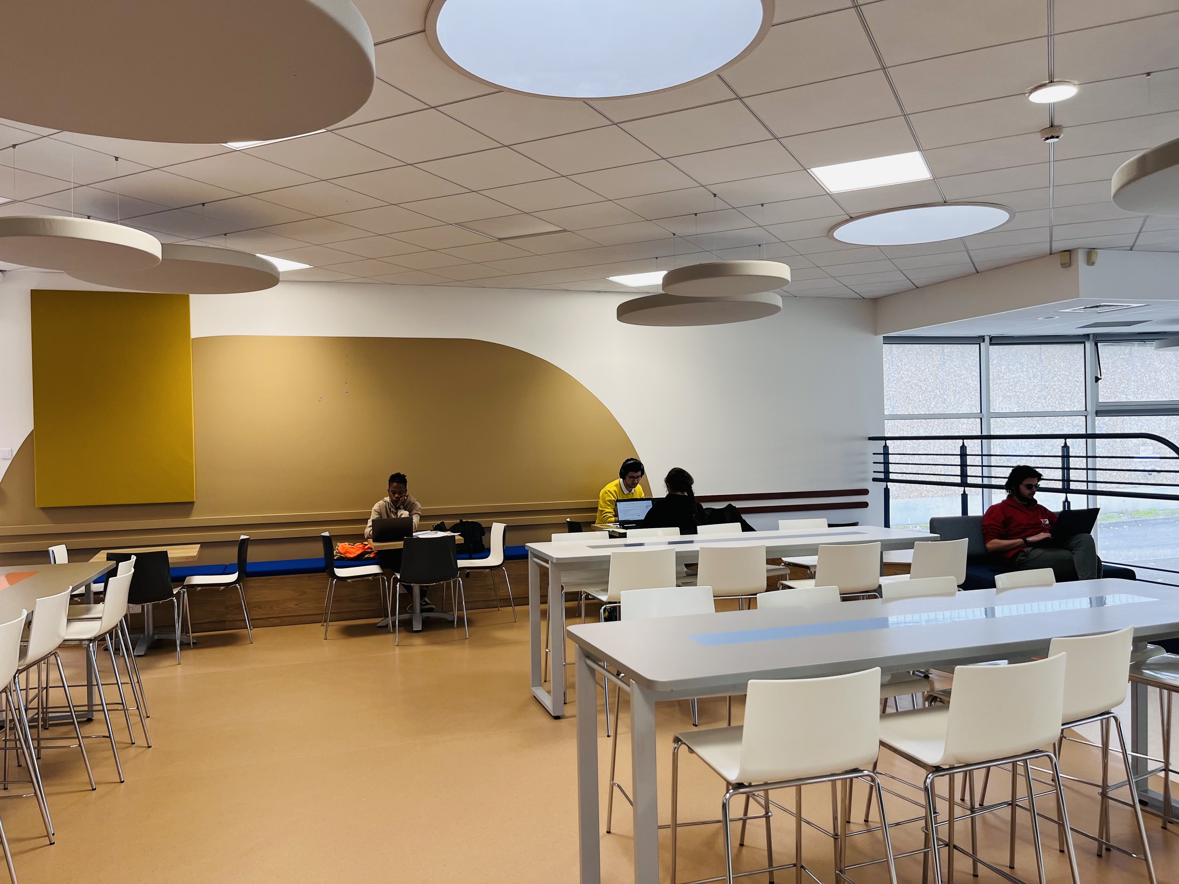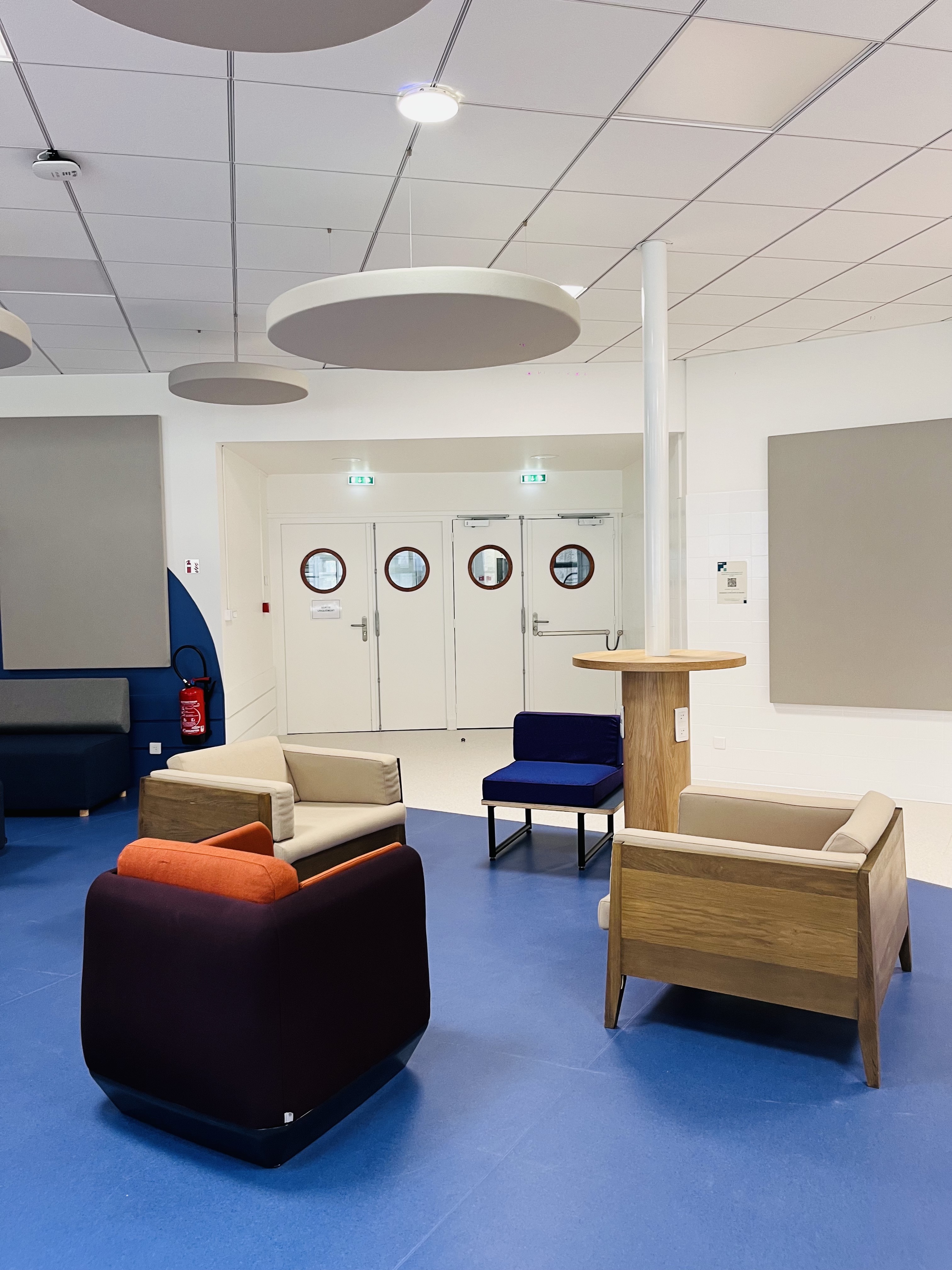 Nous avons également intégré un traitement acoustique en dalles suspendues (fabriquées à Grenoble), nous les avons choisies colorées au-dessus de la circulation centrale pour appuyer cette dernière. La forme ronde de ces dalles permet de s’abstraire visuellement du plafond standard existant et contribue à l’ambiance moderne et ludique du lieu.