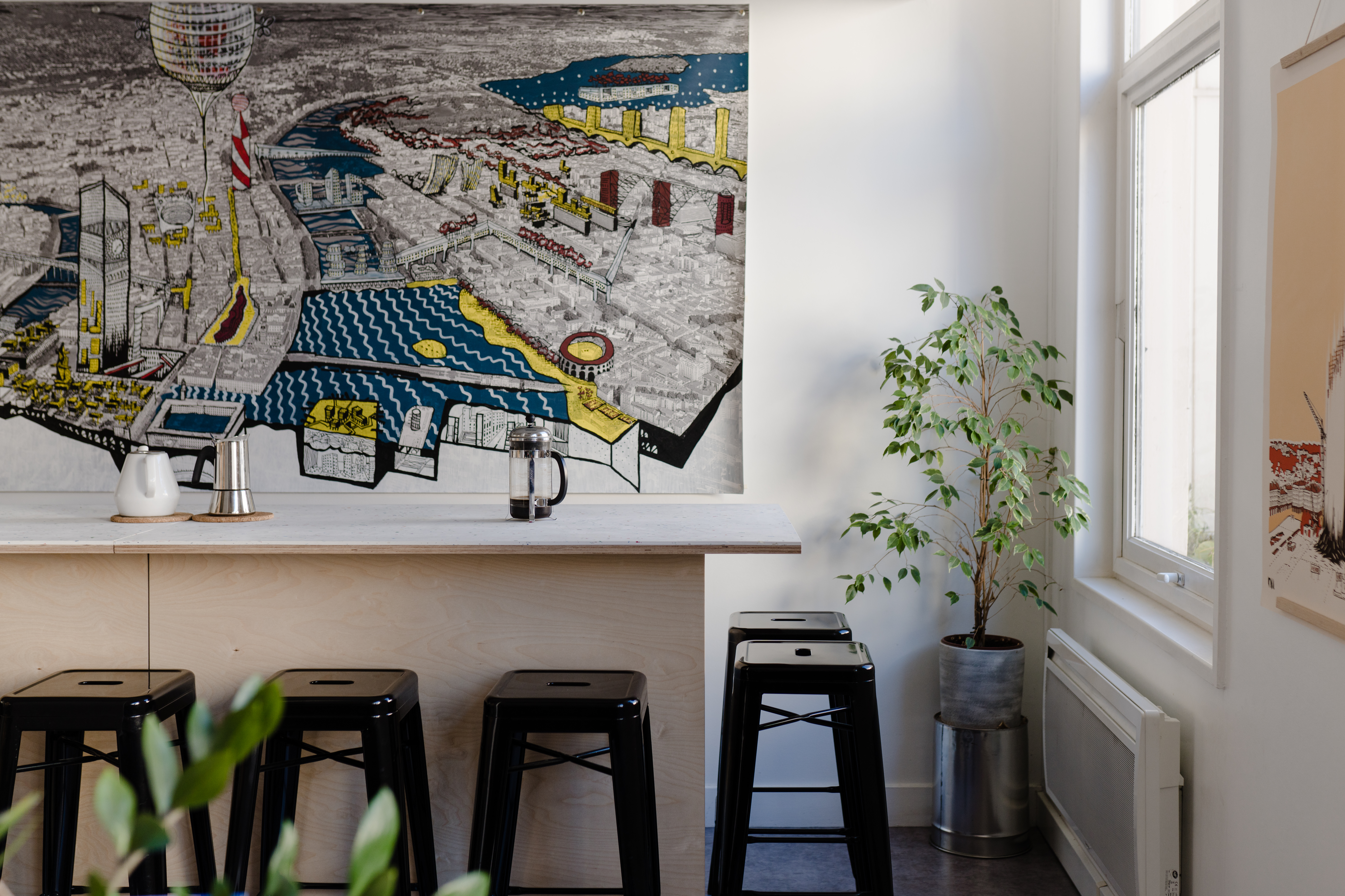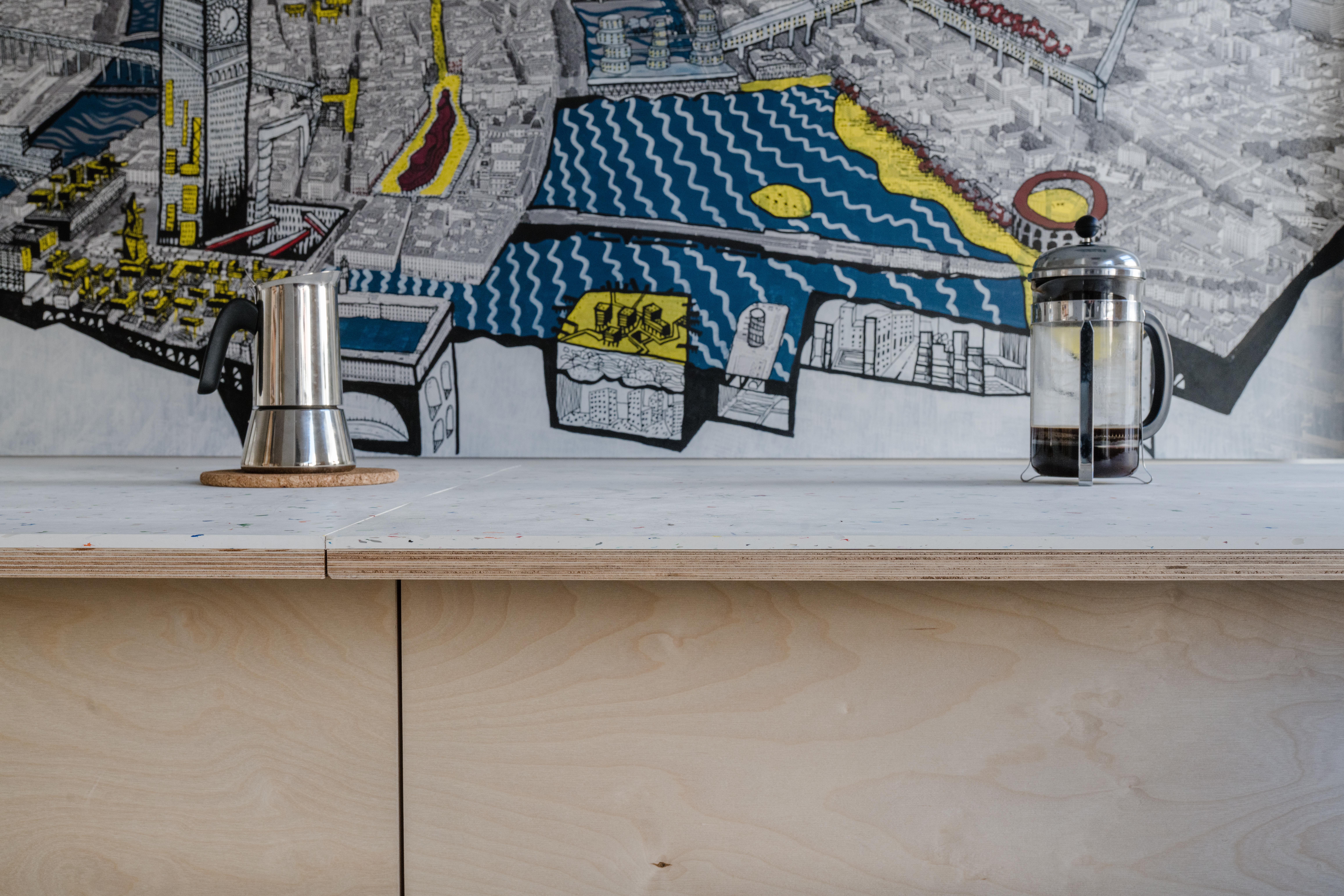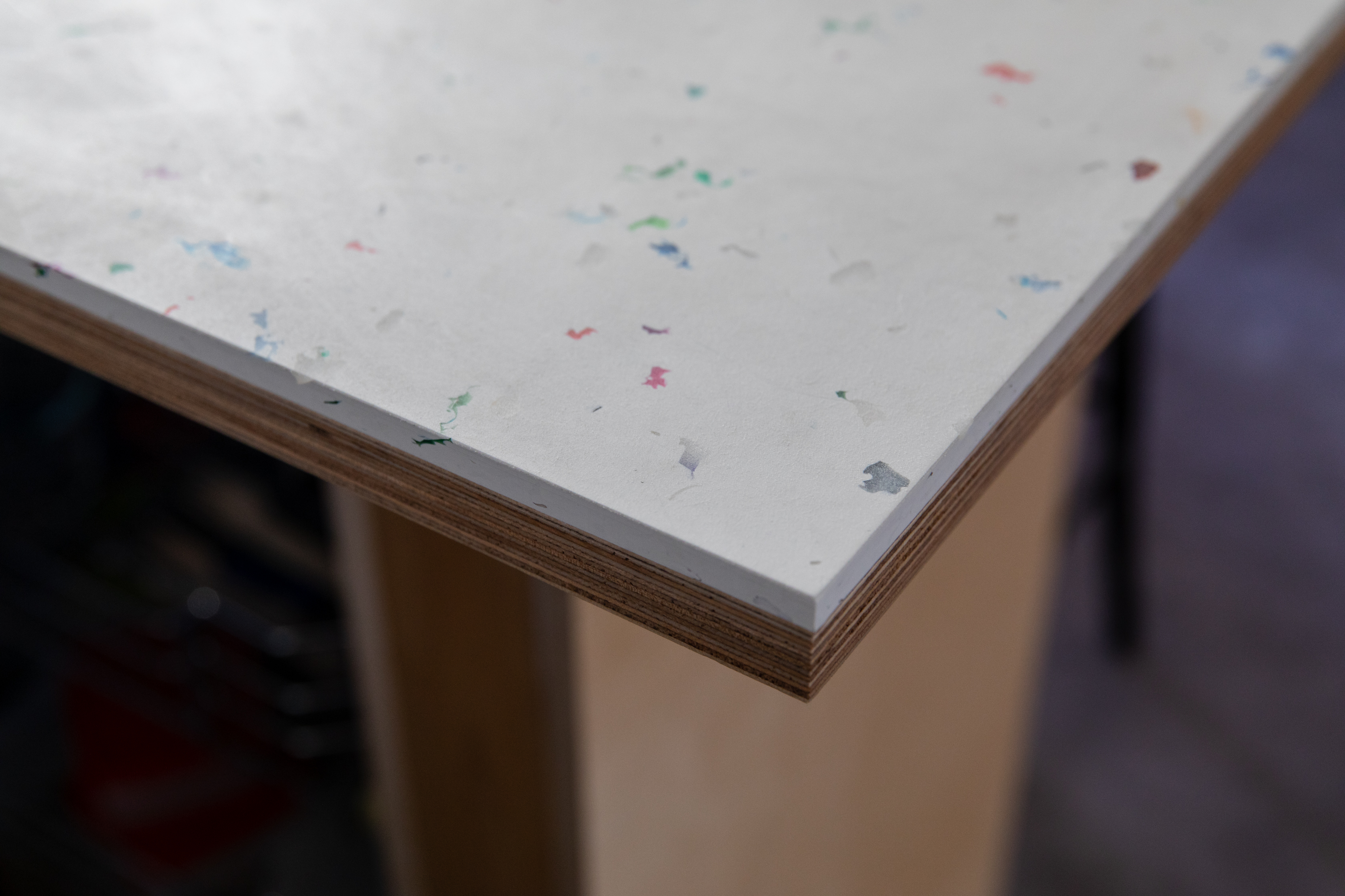 Un comptoir de convivialité désuet et peu fonctionnel que nous avons décidé de conserver comme structure intérieure, habillée de panneaux de réemploi et de plastique recyclé.
