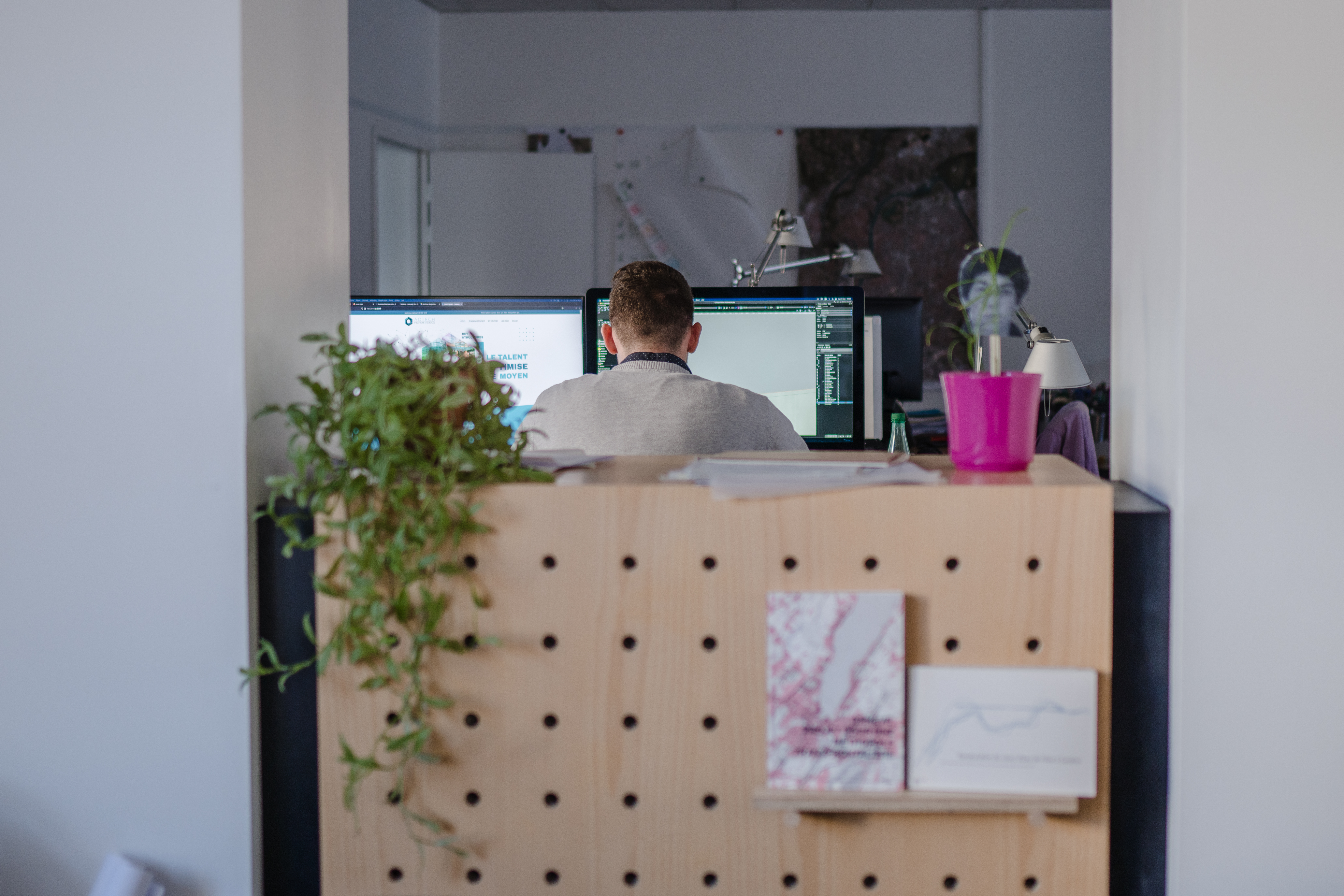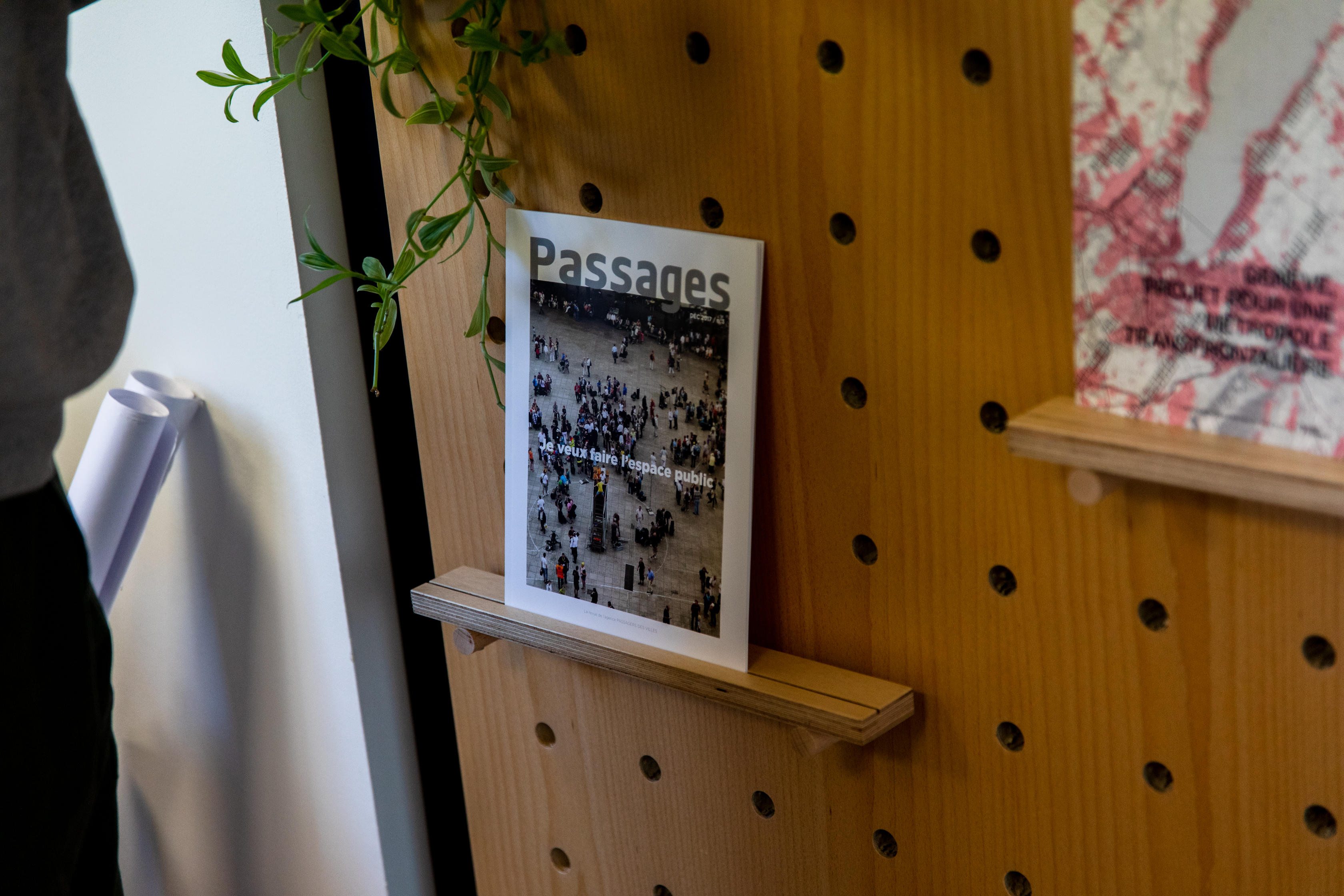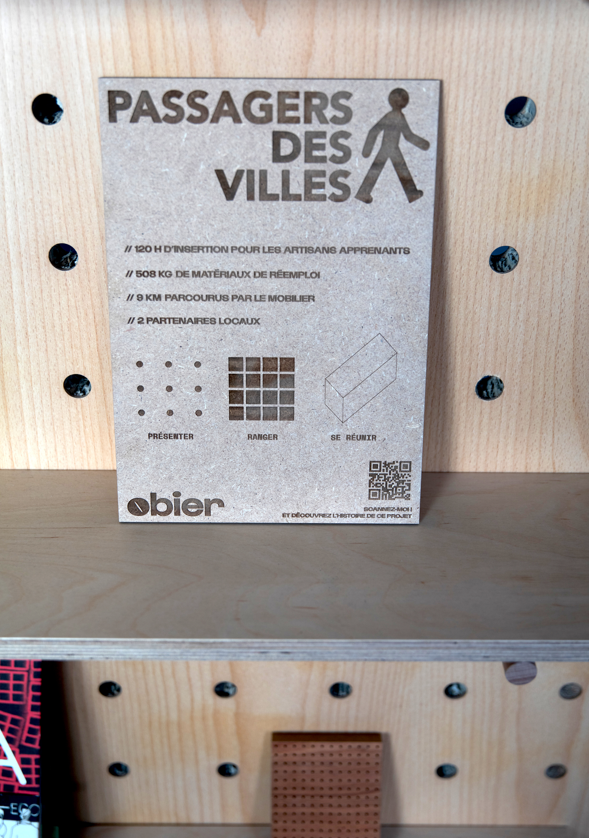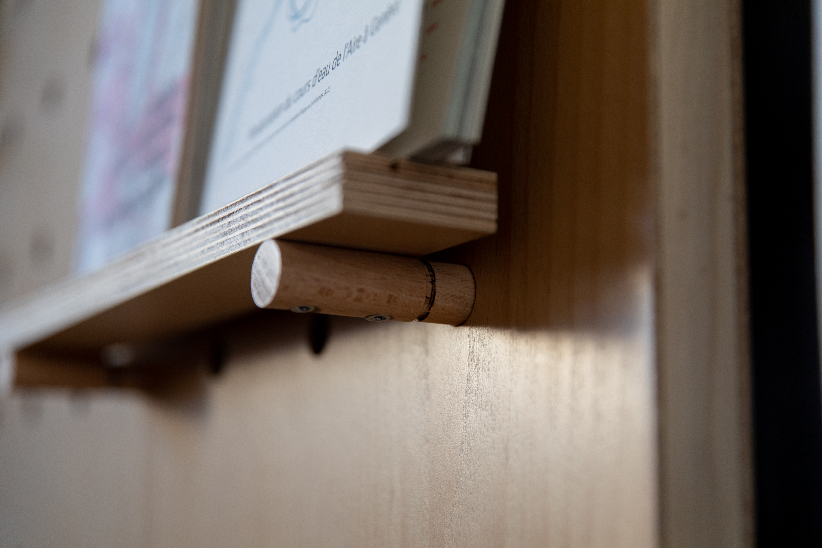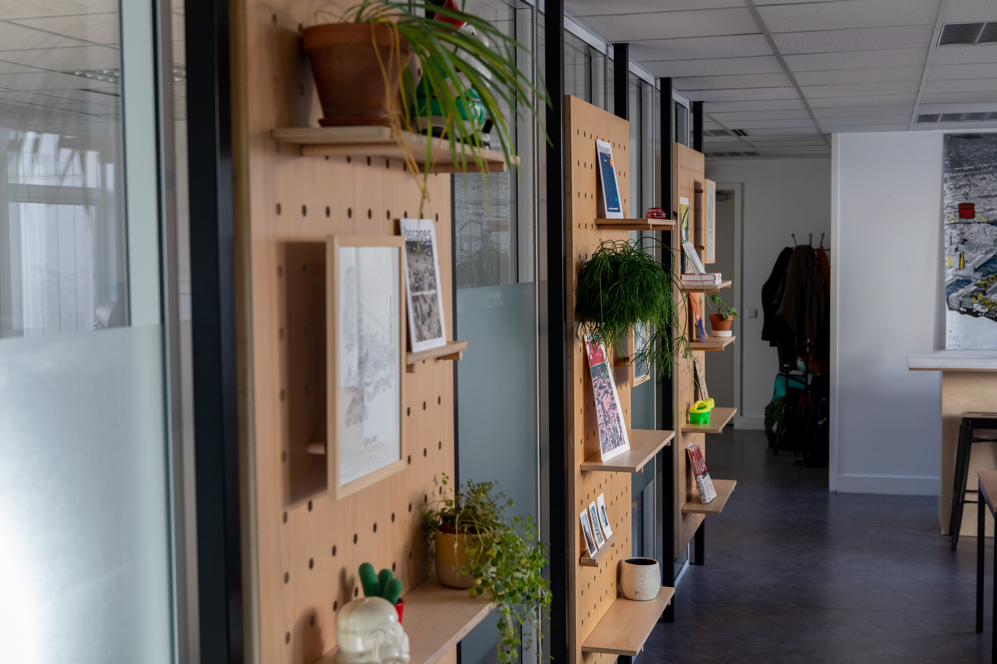 Quatre grands bureaux en bois inutilisés ont été détournés et surcyclés sous la forme de pegboards suspendus sur des échelles métalliques. Les planches d’urbanisme pourront ainsi y être affichées, mais aussi de la documentation ou encore des éléments de décoration participant au bien-être des occupants.