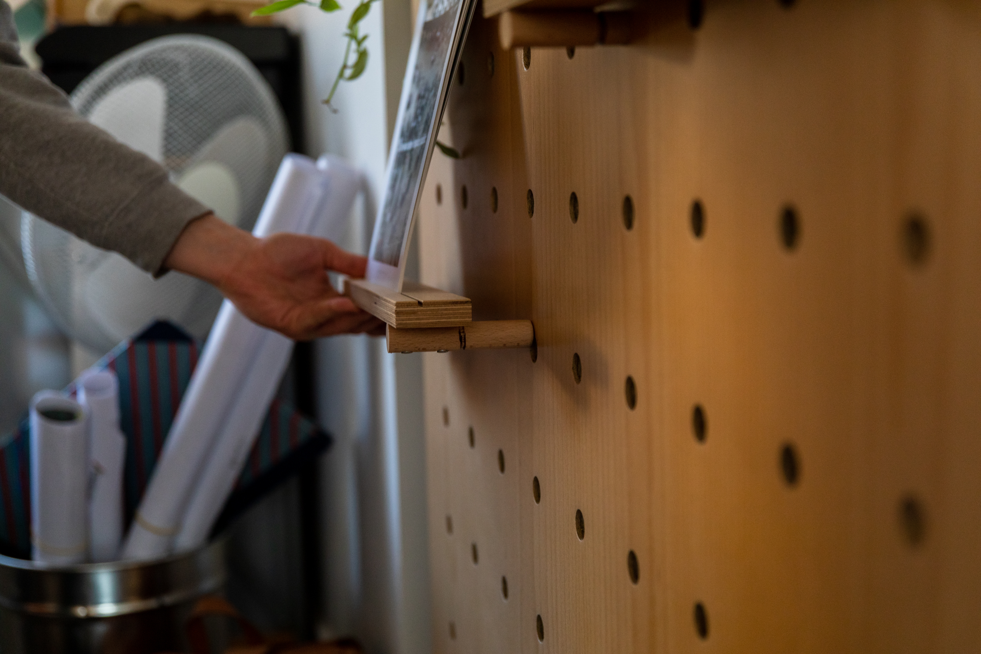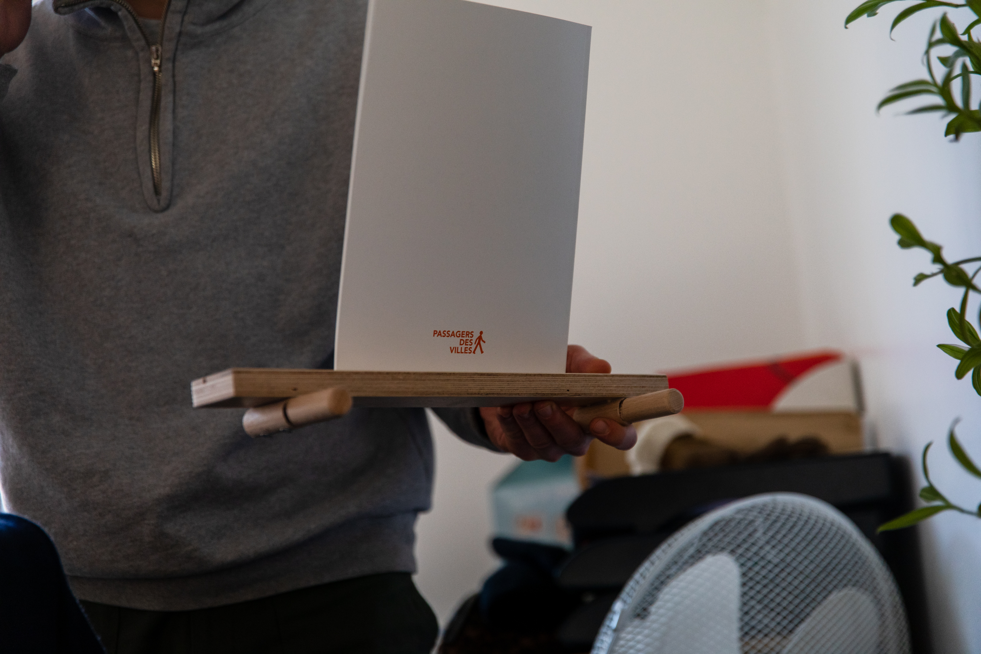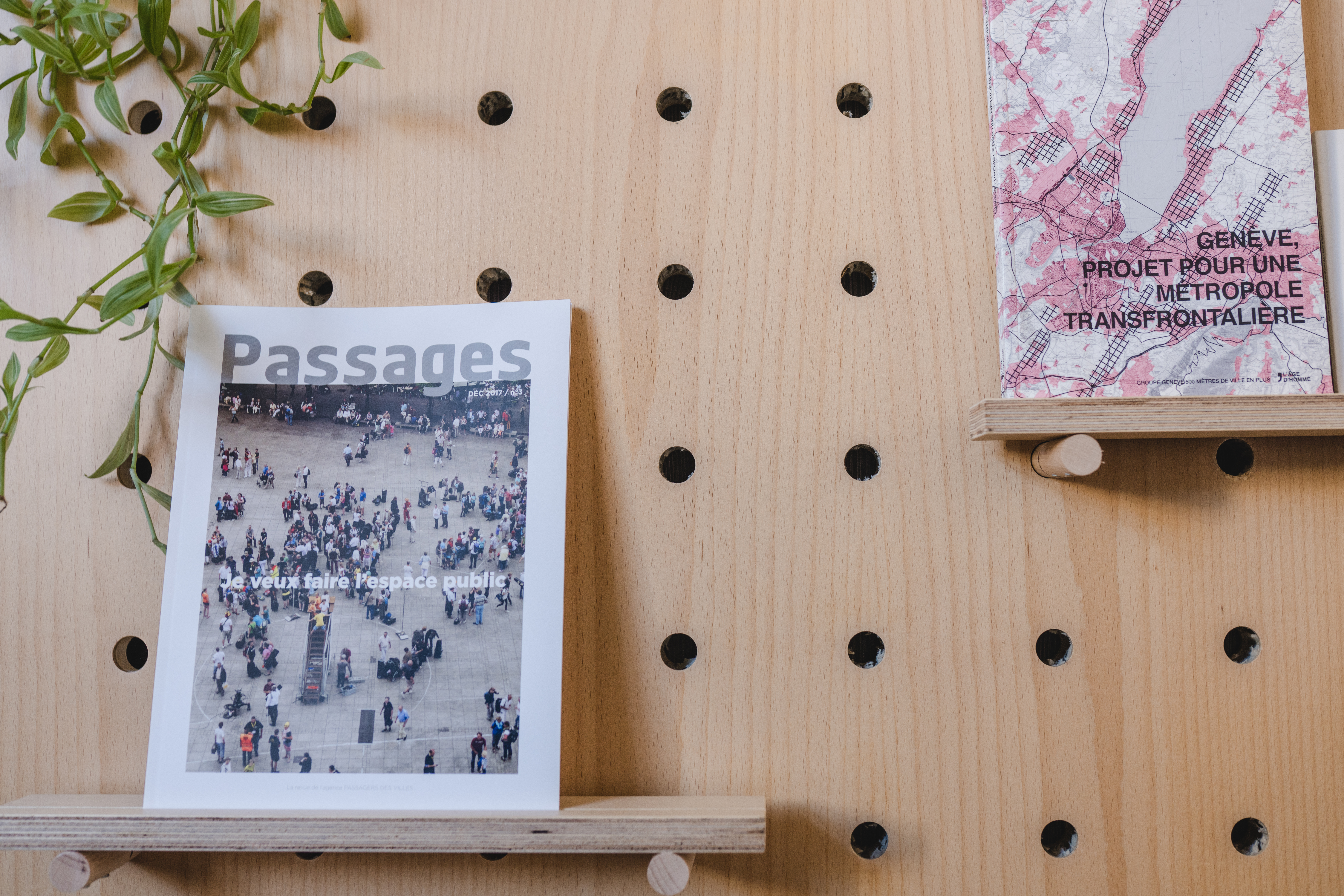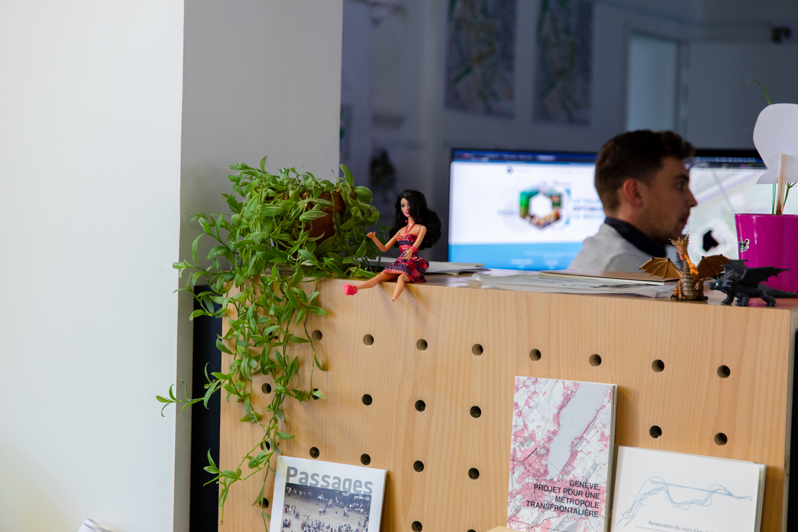 Quatre grands bureaux en bois inutilisés ont été détournés et surcyclés sous la forme de pegboards suspendus sur des échelles métalliques. Les planches d’urbanisme pourront ainsi y être affichées, mais aussi de la documentation ou encore des éléments de décoration participant au bien-être des occupants.