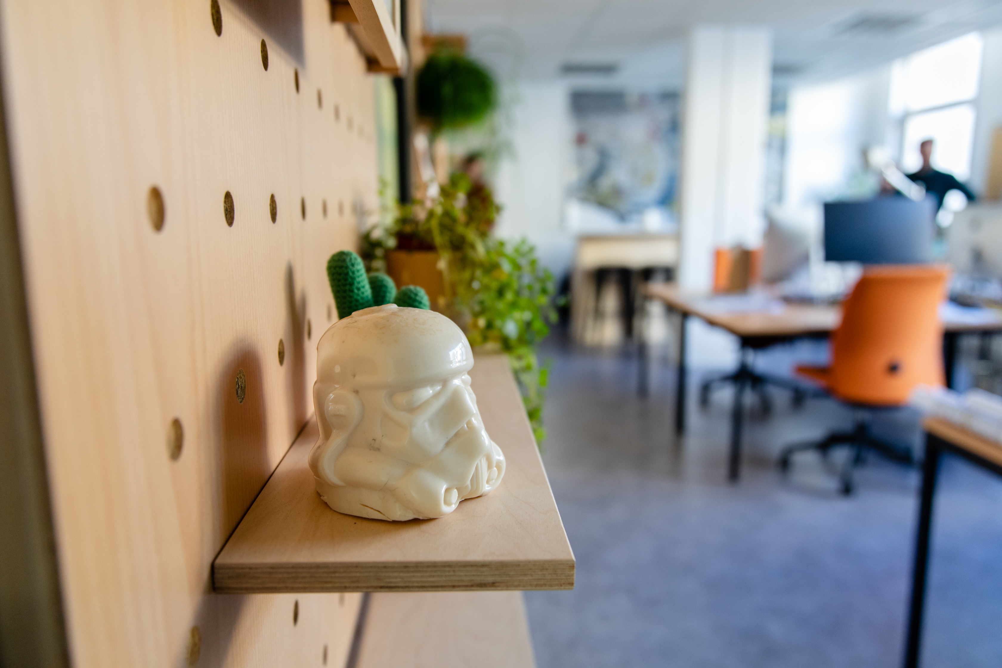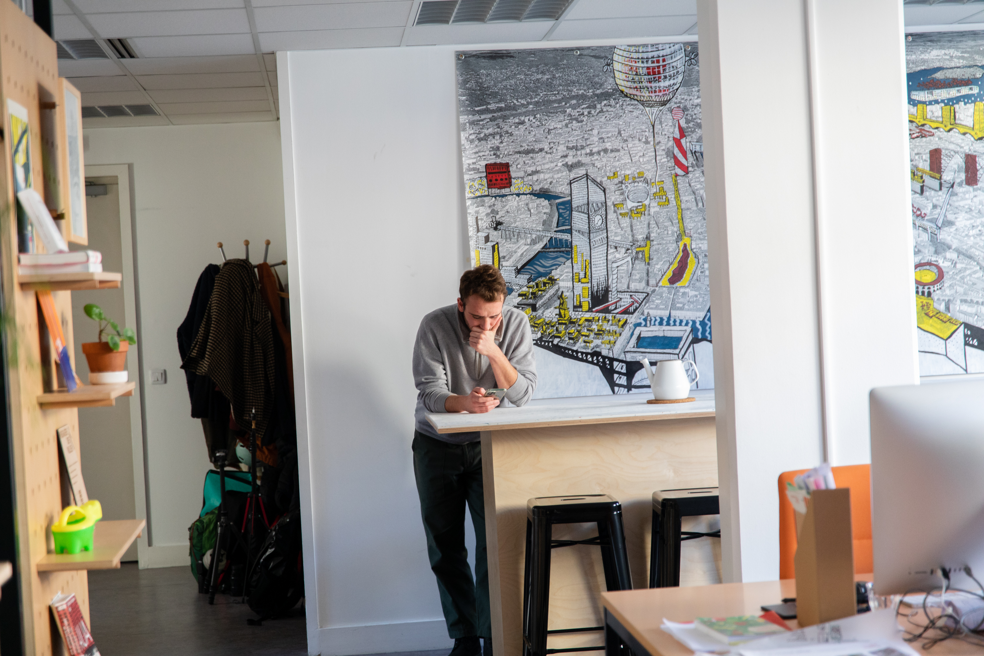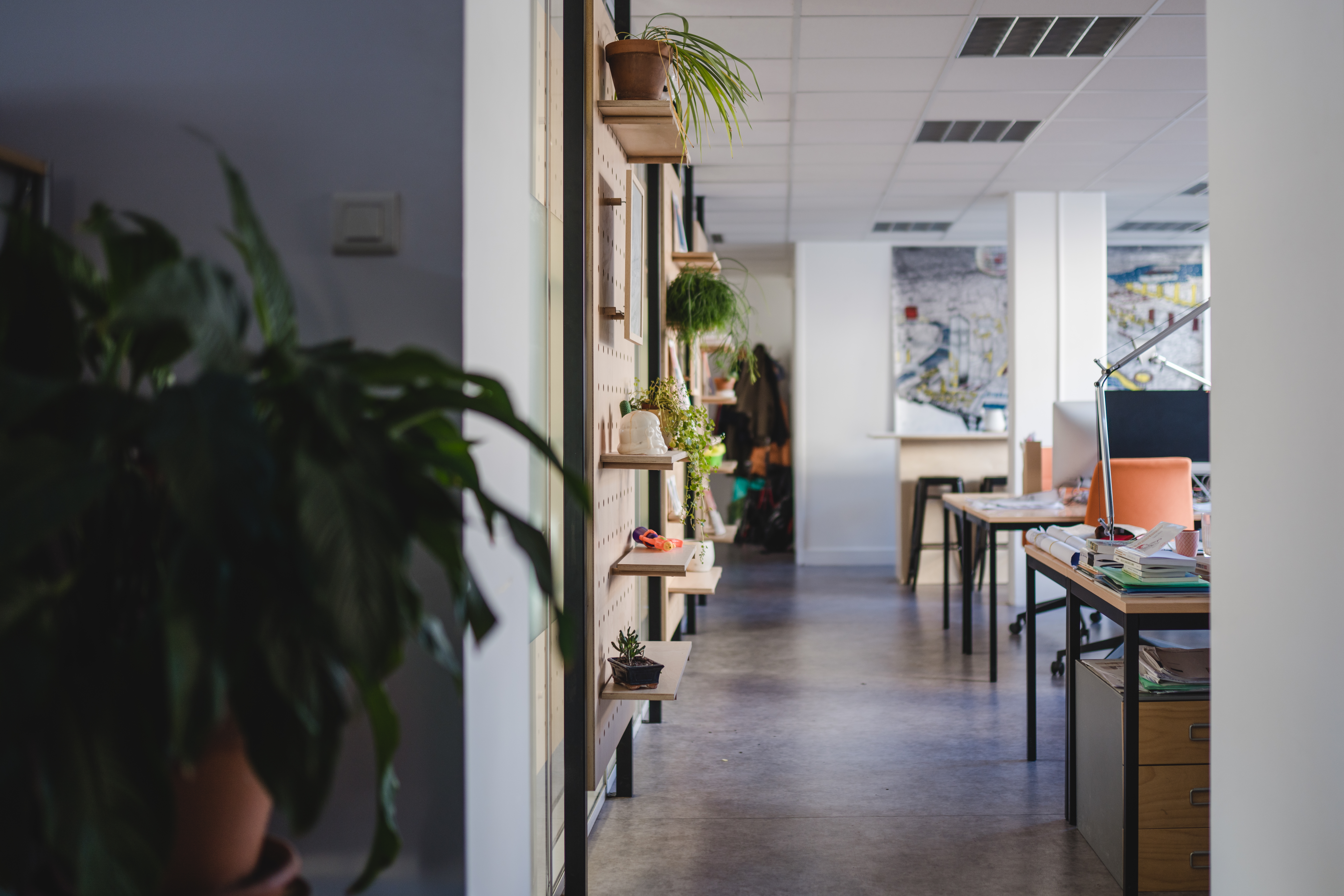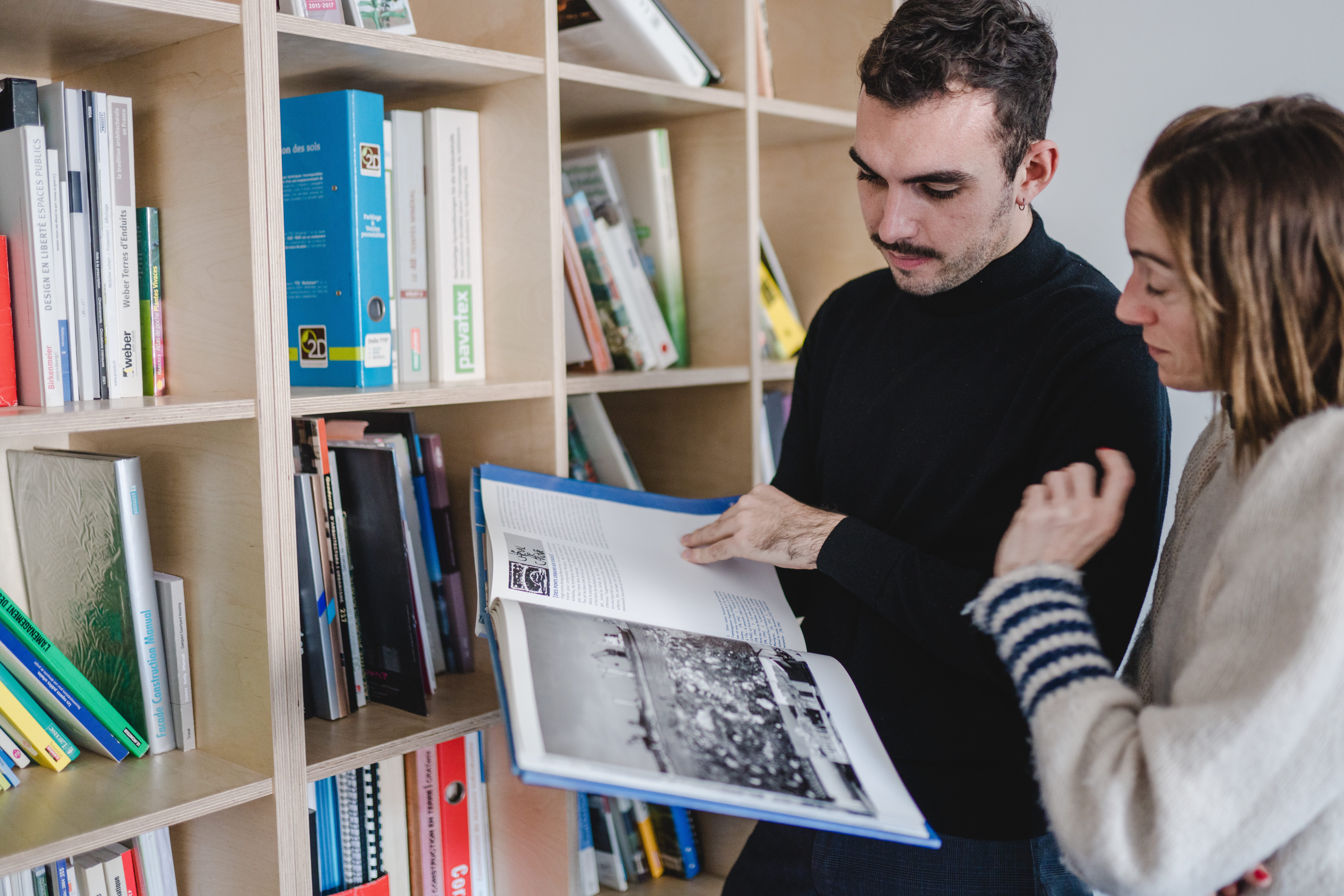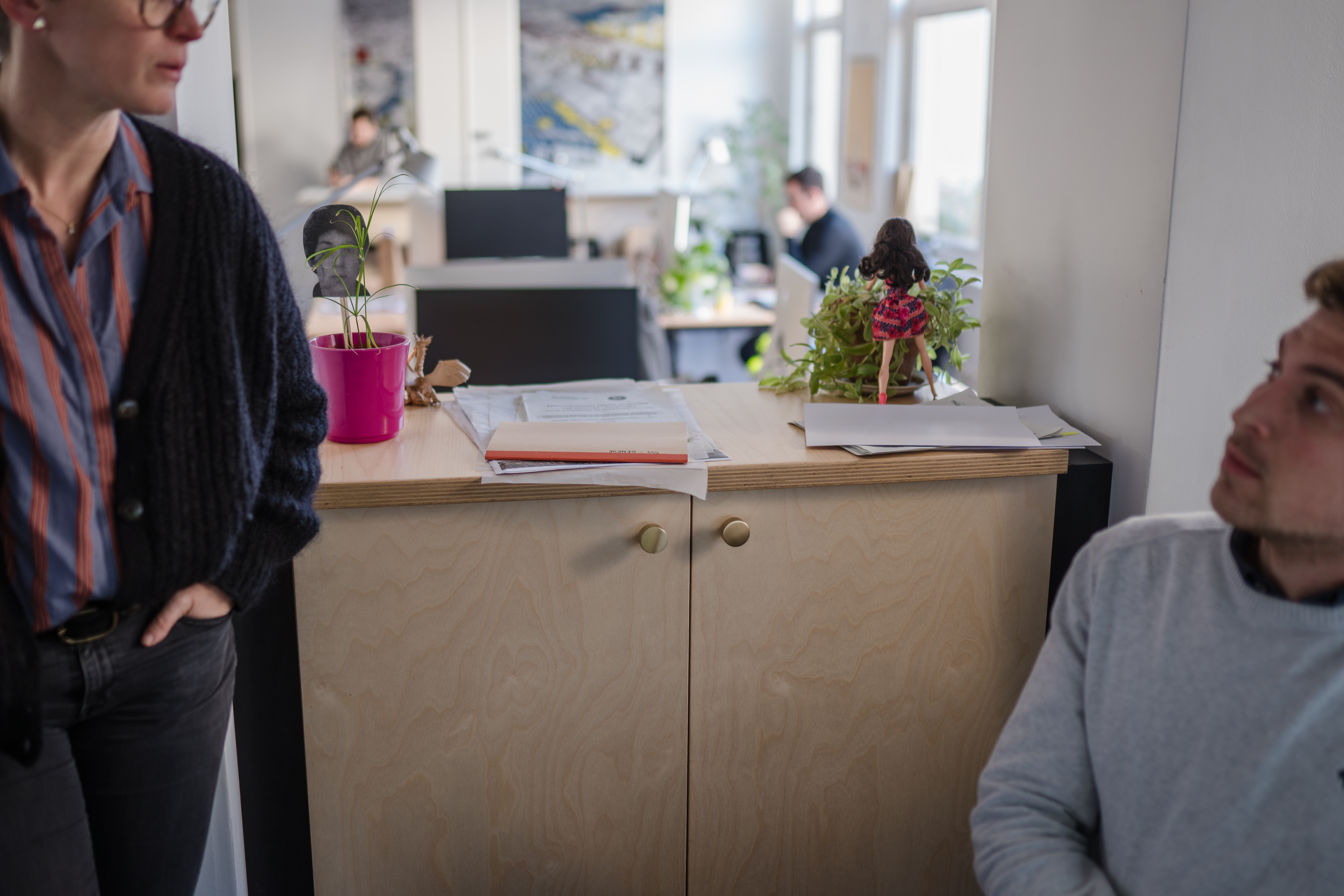 Quatre grands bureaux en bois inutilisés ont été détournés et surcyclés sous la forme de pegboards suspendus sur des échelles métalliques. Les planches d’urbanisme pourront ainsi y être affichées, mais aussi de la documentation ou encore des éléments de décoration participant au bien-être des occupants.