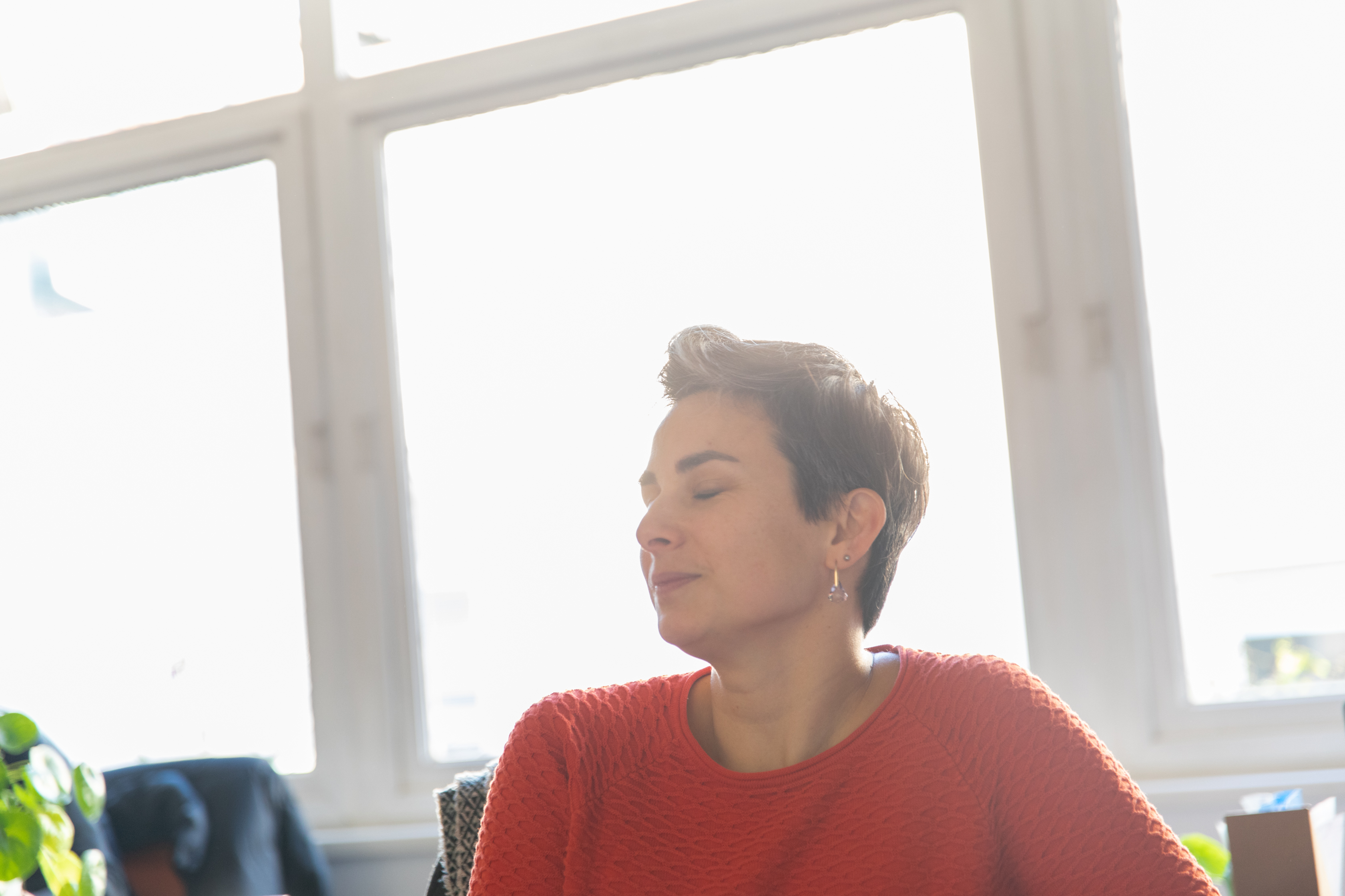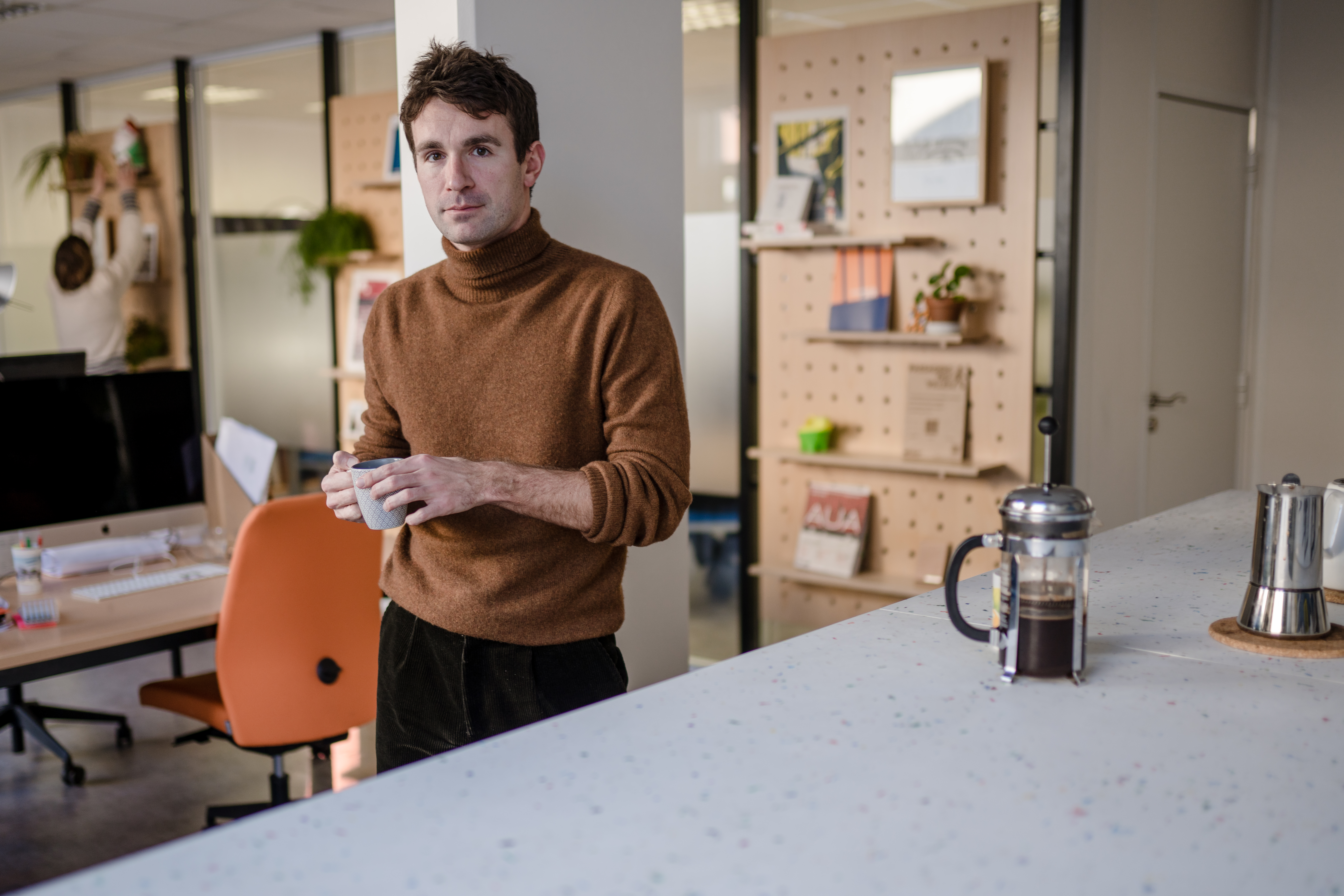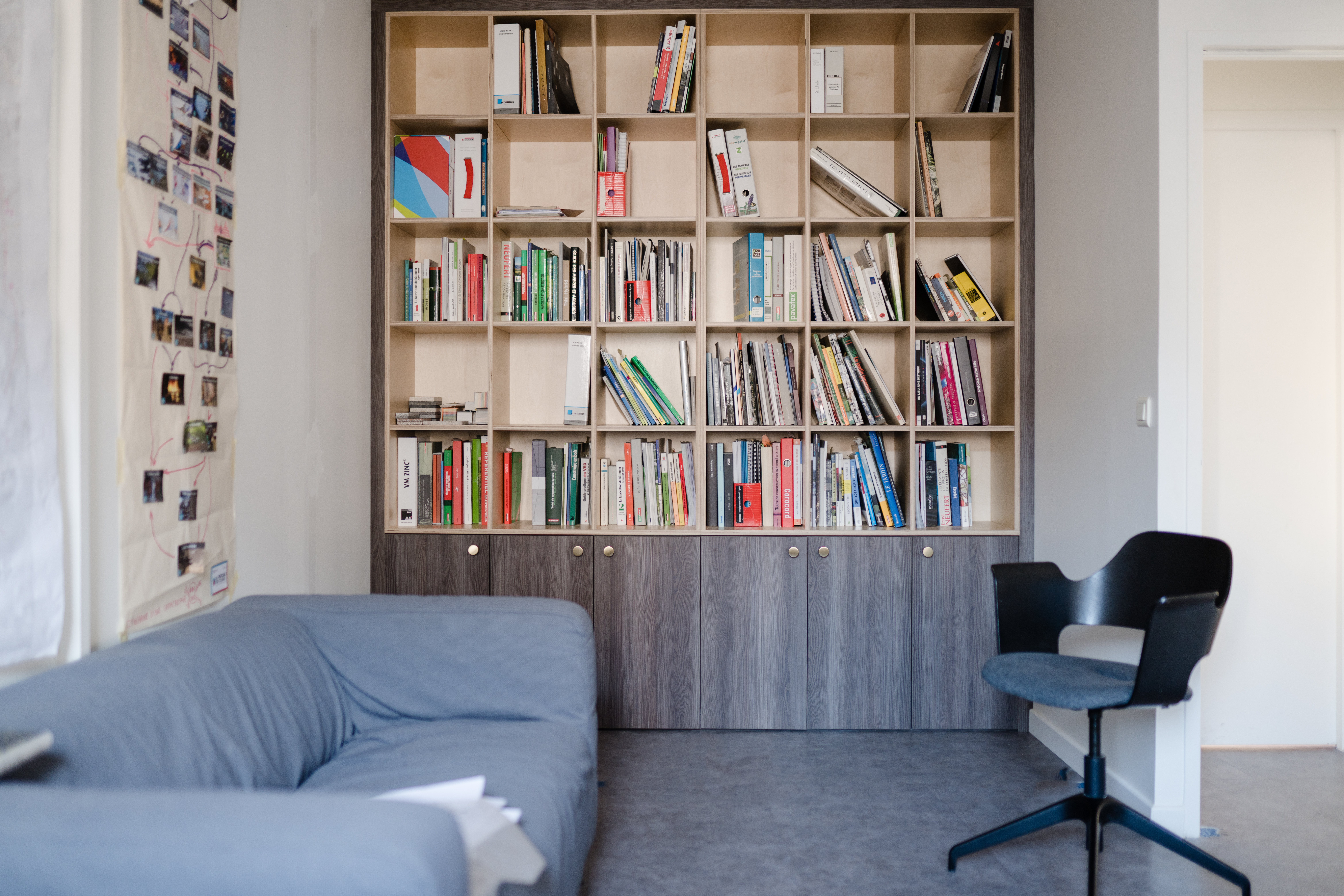Enfin, une cloison a été déplacée entre la petite salle de réunion à agrandir et le bureau de direction légèrement surdimensionné. Un meuble de rangement toute hauteur, fabriqué intégralement en matériaux de réemploi a été intégré dans le renfoncement, améliorant également l’acoustique entre les deux pièces. La trame rigoureuse participe à structurer et caractériser cet espace.