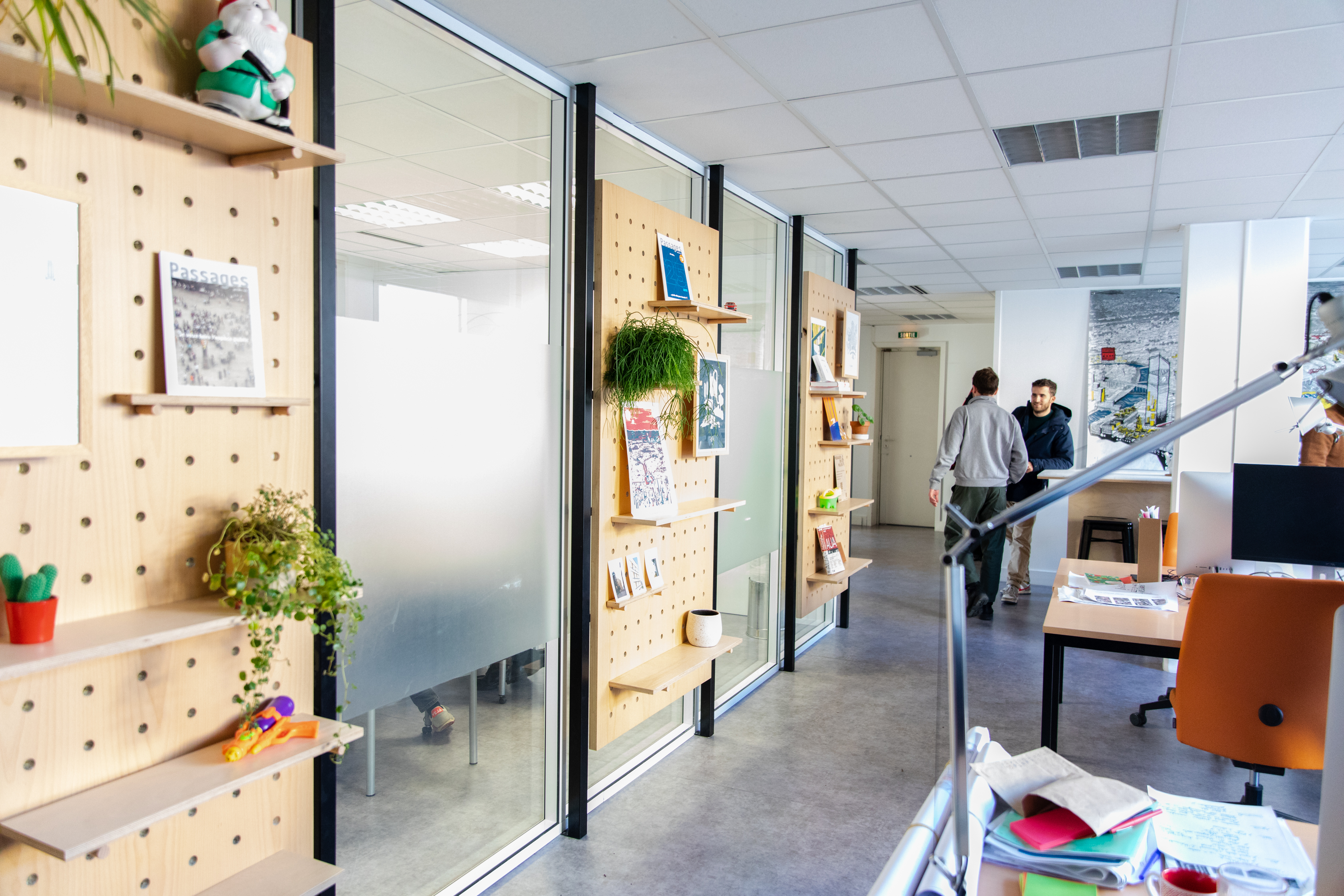 Avec le quatrième plateau de bureau en bois, nous avons décidé d’investir un passage délaissé en y créant un meuble de rangement entièrement fabriqué à partir de matière réemployée. Cet élément recrée de l’intimité de part et d’autre de cette nouvelle limite et canalise la circulation le long des pegboards.